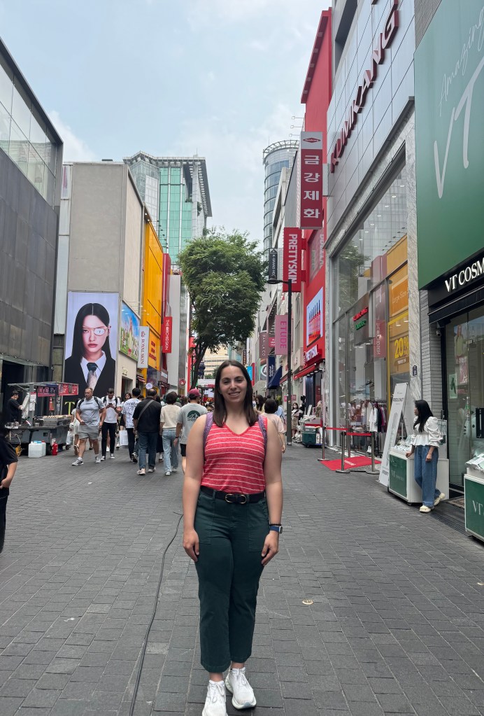 I visited the super cute shopping street of Myeongdong on my first afternoon in Seoul, and it was exactly everything I imagined when thinking about the city. After taking the metro from Seoul Station, I found myself surrounded by vibrant streets packed with the latest K-Fashion and K-Beauty shops, alongside countless K-Pop references that added to the energetic vibe. Since it was a Saturday, tons of street vendors lined the sidewalks, offering all kinds of delicious Korean street food. I spent hours wandering through various shops, picking up everything from quirky keychains to a custom bag I made by ironing on patches—a popular trend there. For lunch, I couldn’t resist trying Korean Fried Chicken, enjoying both the sweet/spicy sauce and the plain version; the batter was much crispier and lighter than what I’m used to back home, making it absolutely addictive. I ended the day at a well-known fried chicken chain that was packed with locals—a good sign, and definitely well deserved. Myeongdong’s streets were bursting with color and endless little alleys to explore, making it an incredibly fun and memorable way to spend my day in Seoul.