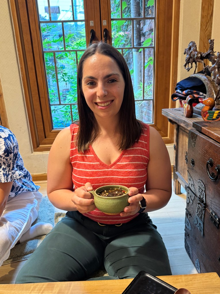 On our food tour, we walked to Insadong, which feels like old Seoul with its ornate buildings and much calmer streets compared to the busy Myeongdong I visited earlier that day. We stopped at an old, authentic tea house that had been converted into a cozy café, where we sat on mats at low tables and enjoyed fancy tea, shaved ice dessert, and traditional Korean sweets like sweet and salty bread. I tried the black herbal tea, known for its many health benefits, just like the other tea we sampled. It was such a great and peaceful experience that perfectly captured the charm of Insadong!