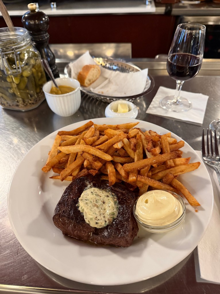 To end the night, I headed back to the Plateau for dinner at L’Express, a classic French bistro that absolutely lived up to the hype. With its cherry wood paneling, crisp white tablecloths, and timeless ambiance, it felt like stepping into Paris. I ordered the celery rémoulade, steak frites (perfectly cooked), and maple profiteroles that were hands down some of the best I’ve ever had—such a perfect nod to Québec’s flavors with a French twist. Add in a great glass of wine, and it was exactly the kind of meal I had hoped for.