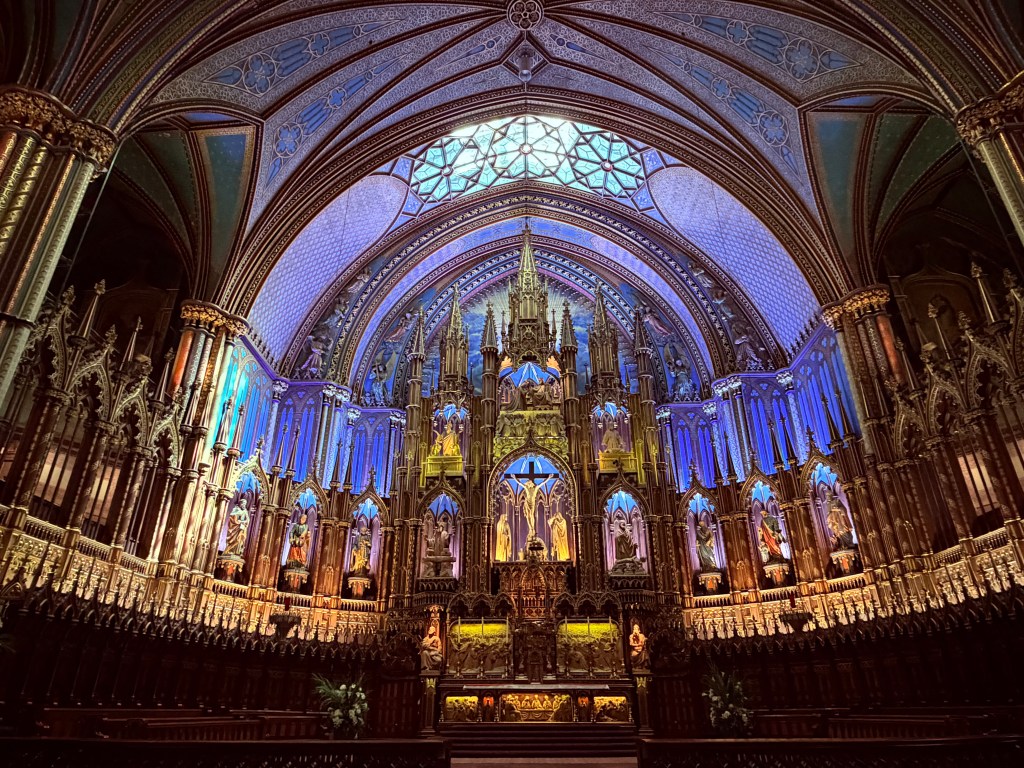 After lunch, I circled back to Notre-Dame Basilica to go inside—and this was easily one of the most awe-inspiring moments of the trip so far. The deep blue ceiling, dotted with gold stars, the intricate woodwork, the sheer scale of it all… it’s one of those places that makes you stop and just take it in. You can see why Celine Dion chose to get married here—it feels grand in every sense of the word.