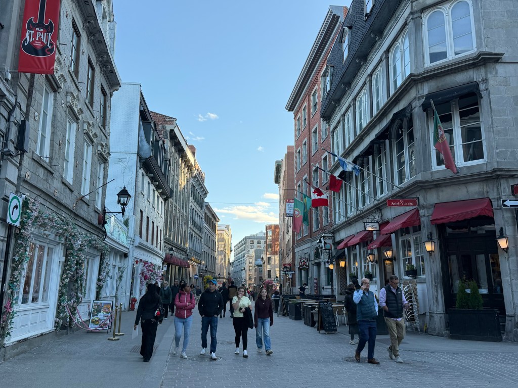 Not long after, I met up with my group for a two-hour walking tour of Old Montréal, and the timing couldn’t have been better. Blue skies, perfect temperatures—it was one of those days where everything just clicks. Montréal itself dates back to 1642, originally founded as Ville-Marie by French settlers. Over time, it evolved into a major trading hub, shaped by both French and British rule, which explains the unique blend of culture and architecture you see today.